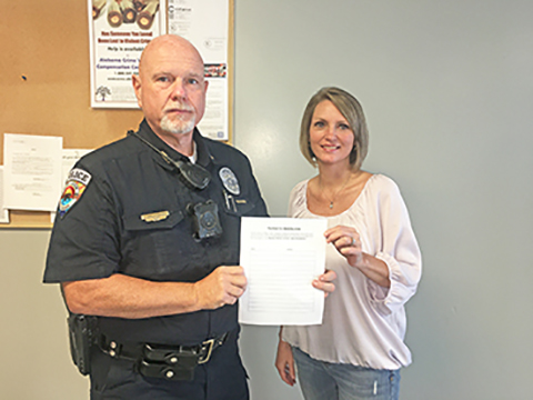 Bear Creek Police Chief Kenny Hallmark and Bear Creek Town Clerk Kay Wiginton show the petition voters in Bear Creek can sign if they want to vote on alcohol sales.