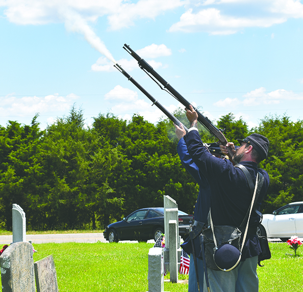 MARION/WINSTON - Many hardships were endured in the hills of northwest Alabama in the 1860s. It was brother against brother, literally, and hard times for the folks at home who were dealing with raiders and pillagers. Throughout the war, Winston and Marion counties furnished numerous soldiers to the First Alabama Cavalry, a Union regiment. These individualistic people fought for what they believed in. Some died for what they believed in. On Sunday, June 14, which was Flag Day, camp members of the Sons of Union Veterans of the Civil War, operating under the Croxton Camp of Birmingham, gathered and led a driving tour to four local cemeteries to honor members of the First Alabama Cavalry. Speeches were given, flags were placed on graves, prayers offered and a military salute was given to those who have passed on. Overlooking the hills at Whitehouse, three men were recognized: Robert Henry Logan, Thomas Basil and John Gilbert Moore. The next stop at Thornhill, Andrew Mitchell and Bazel Tidwell and his wife Prudy were honored. New Hope Cemetery, just inside Marion County, was next with John B. Kimbrough and William Edmond Guttery. Lastly, George W. Whitehead at Littleville Cemetery was given honor. Dianne Miller of the Winston County Genealogical Society gave an account of the lives of Bazel and Prudy Tidwell, her ancestors, and the hardships they endured during the Civil War. “This is our dedication to their memory and the principles for which they fought,” Joel Mize, of the SUVCW, said to the gathering at Whitehouse. “With bowed heads, solemn tread and voices hushed, we meet to remind us of our duty to the soldiers, sailors and marines who wore the blue, to the pride for which they fought, for the country for which they died, and it is for us to keep green the memory of their heroic service and unselfish sacrifice.” There were 26 in attendance for the event. One member from the Daughters of the American Revolution, three members from the Sons of the American Revolution, one member of the Society of 1812 and all three SUVCW camps in Alabama were represented at the gathering.